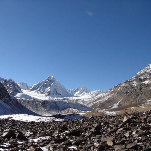 Efter en times tid steg vi af hestene og sneg os op bag en stor sten, hvor der kunne være en chance for at de Ibex, der var blevet spottet aftenen før, ville komme ned ad bjerget i takt med at solen stod op. De kom dog som frygtet aldrig. Da det efterhånden var blevet for stejlt til at kunne ride, tog min far og den ene spotter hestene tilbage ned til floden, mens jeg forsatte med de andre på en længere pürsch til fods op langs den stejle skråning, som bestod primært af løse sten. Luften var tynd og kold så alle de mange timers træning hjemme i flade Danmark kom mig til gode. Der var stadig ingen dyr i sigte…