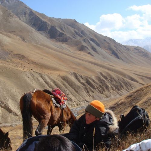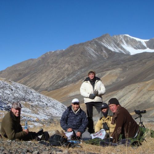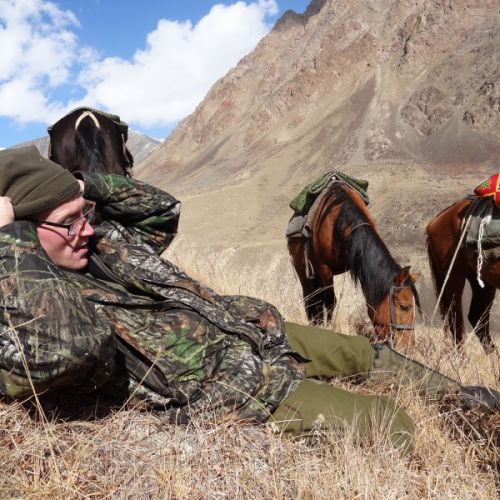 Turen forløb uden problemer. Vi kørte langs den store sø Issyk-kul, som er ca. 280 km lang. Vi passerede bjergpas på over 4.000 meters højde. En fantastisk natur. Køreturen er lang, men forventningerne var store, så det føltes ikke så langt. Vel ankommet til lejren, som lå i ca. 3.300 meters højde i Tian-Shan bjergene, var det tid til udpakning. Vi fik tildelt et værelse med rigtige senge, ligeledes var der også en kakkelovn, så det var en luksuslejr vi var ankommet til. Det er ellers ikke lige det, jeg er vant til fra tidligere bjergjagter. Efter lidt mad, gik vi tidligt i seng. Næste morgen bød på minus 12 grader. Efter morgenmad skulle der indskydes, hvilket forløb planmæssigt. Hestene var sadlet op, og vi kunne ride afsted. Hestene var meget godmodige. Vorherre har ikke tænkt sig om, da han skabte manden og hesten. Der er ”noget” der er i vejen. Vi red ca. 2,5 time før vi spottede den første gruppe ibexer. Der var en med gode horn iblandt. Når man siger gode horn, mener man mellem 90 cm og 1 meter. Denne her var over 1 meter. Vi startede opstigningen med hestene indtil dette ikke længere var muligt, herefter var det til fods. Luften er tynd, når man som her når op i 3800 meters højde, så det er ikke nogen skam at puste lidt. Pludselig kommer flokken løbende ca. 300 meter ude, men den store var desværre ikke iblandt. Vi ventede ca. 1 time, men forgæves. Så turen gik igen nedad, hvilket også kan være hårdt. Efter nedstigningen var det tid til frokost. Denne blev indtaget på et tæppe i sneen, men i det dejligste solskin, og med et fantastisk udsyn over bjergene, hvor vi kunne se Marco poloer gå og græsse. Frokosten bestod af brød, pølse, ost, karameller, vand og te. Temperaturen var ca. 0 grader. Efter frokost skulle vi videre ind i et nyt pas. Den ene guide red i forvejen for at spejde. Da vi ankommer, står han med et stort smil på. Han havde set en flok på 4 ibexer, hvoraf der er 2 gode iblandt. Taktikken er, at vi skal snige os op bag en lille klippe ca. 400 meter oppe. Nu er det vigtigt, at alle 5 yder det bedste udi at gøre sig usynlige. Min kone er med for at filme, men må erkende, at det bestemt ikke er som i de spanske bjerge, og hun må opgive at komme med op.