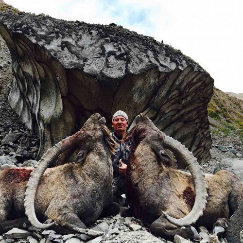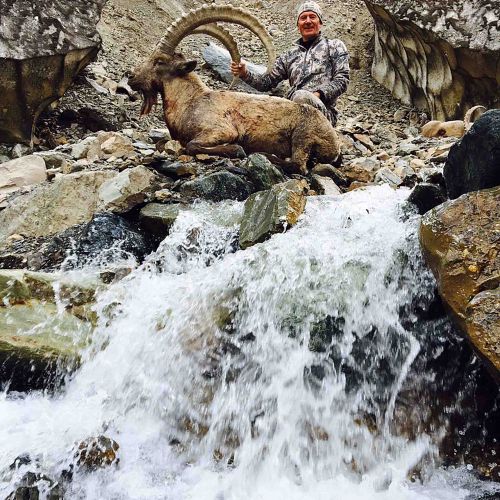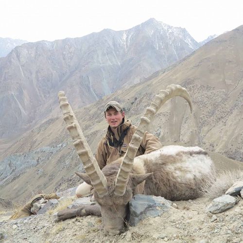 Da vi når op til klippen, går der kun 3 stk, men gudskelov er de 2 store der. Jeg spørger tolken 2 gange, hvilken en der er størst, han hører det dog ikke, og jeg må sparke til ham, før han siger, at det er den forreste, men nr. 2 er også okay. De går alle 3 i en klump, og jeg kan derfor ikke skyde. Afstandsmåleren viste 307 meter. Jeg ved at kuglen falder ca. 20 cm., så det er at holde lige på rygraden. Den største bevæger sig fremad, med bagenden imod mig. Det føles som en evighed inden den stopper og drejer en anelse til højre. Jeg føler selv at have et godt hold på den, og jeg vælger at skyde. Dyret sætter i gang, uden at vise skudtegn overhovedet. Jeg repeterer, og skyder igen og igen. Dyret stopper og jeg holder en halv meter over. Tolken skriger, for lavt. Nu er det sidste skud, og jeg holder en hel meter over dyret. Ibexen falder i skuddet. Vild jubel. Det viste sig, at der var 458 meter op til dyret. Endelig havde jeg fået min Midt Asian ibex. Da vi endelig kom op til dyret viste det sig, at mit første skud, havde ramt dyret, men bare 10 cm for langt tilbage, men den havde dog taget spidsen af lungen. Utroligt, man ikke kan se skudtegn. Det fortæller lidt om, hvor skudstærkt et dyr det er.