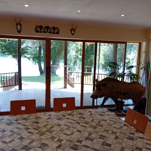 Priserne er inklusive ophold med helpension i meget komfortable jagthuse indrettet med trofæer og ægte jægerstemning. Forplejningen er rigelig og god, og med i prisen er også alle drikkevarer, også de lokale vine og øl. Bulgarien er kendt for sine gode vine. Billedet viser det særdeles hyggelige jagthus på en af de store øer i floden...
