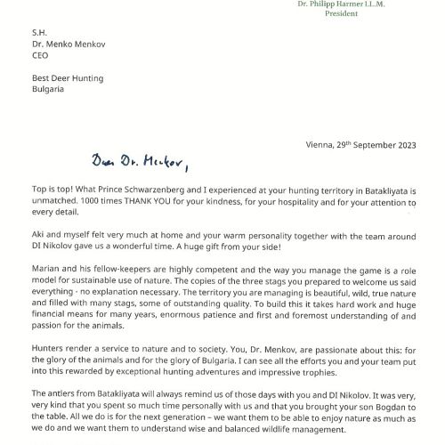 Det er en særdeles jagtinteresseret og passioneret, velhavende Bulgarer, som for flere år siden lavede aftale med statsrevirerne, om at pleje netop disse revirer. Der er ikke sparet på hverken revir- eller vildtpleje og han er i øjeblikket ved at bygge en større jagdlodge på et at de største revirer, da de også påtænker at opstarte...