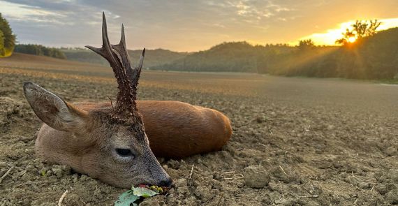 På kanten af kornmarken skød skoven ud i marken, nærmest som en tange. Dette sted blev vores “stand” med udsigt mod øst. Solen var lige gået ned. Da Lucas første gang afsøgte majsmarken med kikkerten, blev han ret tændt og satte hurtigt skydestokken op. I mellemtiden kunne jeg også se bukken. Dyret befandt sig mellem nogle majsrækker. Jeg kunne ikke se dens krop, men der var masser af opsats, der stak op. Jeg satte riflen i skydestokken og sagde til Lucas; "OK. Få ham op.". Lucas råbte. Intet skete. Han råbte igen og højere. Bukkens ører bevægede sig. Lucas råbte nu virkelig meget højt og så var der bevægelse. Jeg vidste af erfaring, at selv hvor atletisk, yndefuldt og hurtigt et rådyr er, så rejser det sig ikke hastigt op fra søvn. Først kom dyret på forben, så oprejst, hvorefter den strakte sig. Denne gang var lykkens gudinde med mig. Bukken stod op. Skuddet var velplaceret, og dyret var nede.