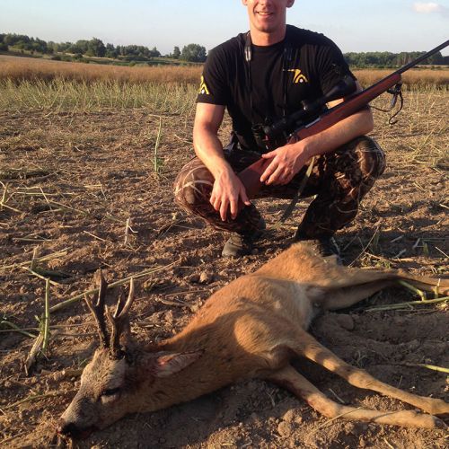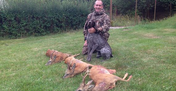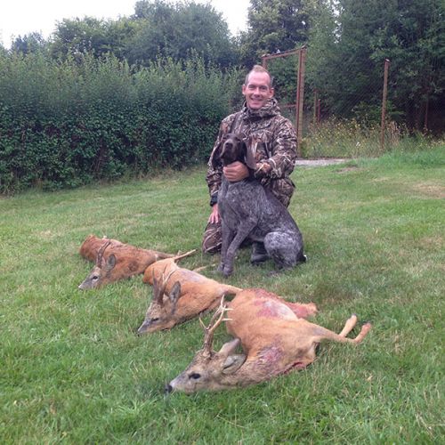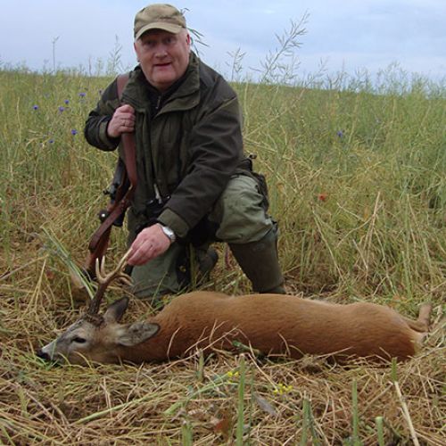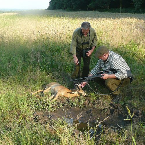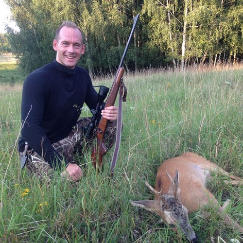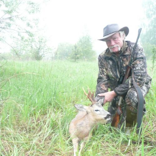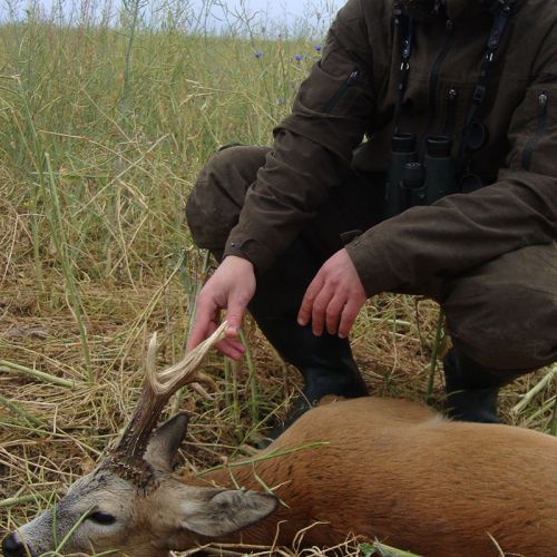 Min jagtfører stod og vurderet hjorten, og til sidst fik jeg tegnet – den er selektiv, og perfekt til afskydning. Pürchen blev sat i gang – Hjorten var gået igennem nogle træer, og havde kursen mod et åbent stykke eng. Vi pürschede os ind på 70 meter, og spændingen steg, hjertet bankede hurtigere – feberen havde meldt sin ankomst – men hjorten stod perfekt med bredsiden til, så det var en skuddet skulle falde, inden den fik færten af os. Hjorten blev ramt med en perfektbladkugle, men kæmpede en kamp for at forsætte, så den fik endnu en kugle og faldt efter denne. Feberen forsatte efter denne fantastiske pürch med et fantastik resultat, og benene rystede, så der skulle gå fem minutter, før vi kunne komme hen og se hjorten. En fantastisk hjort ventede os – en fuldstændig regelmæssig 10-ender på 6,3 kilo var forendt, og en lykkelig og glad jæger stod ved siden af, og nød oplevelsen til fulde.