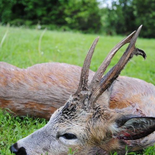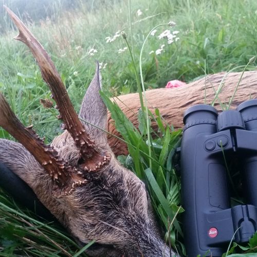 30.05. Efter en kop te var der afgang i terrænet kl 04,00. Mathæus kørte ud i et landbrugsområde med små marker og lidt hegn. Her blev bilen parkeret og vi gik lidt rundt. To smaldyr fjantede rundt. Lidt efter blev de efterfulgt af en spidsbuk. Med tanke på min forbier fra aftenen i forvejen prøvede vi, om vi kunne komme til skud på bukken. Det lykkedes, og den faldt perfekt for kuglen. Afstanden var ca. 100 m og dermed betydelig længere end ved forbi skuddet