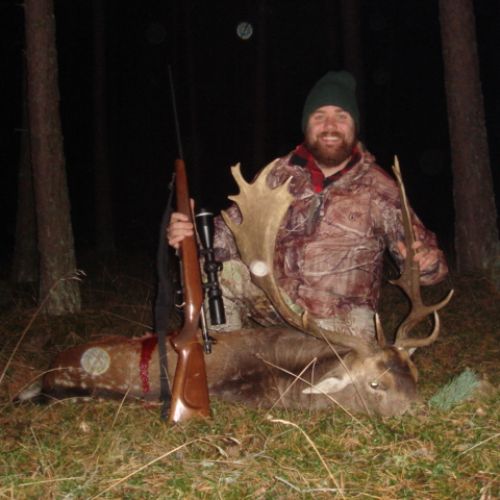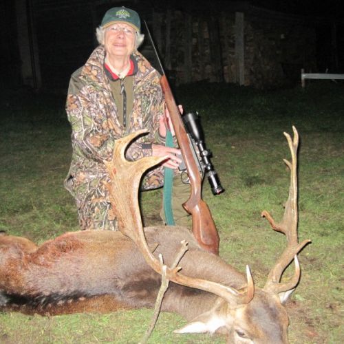 Jeg brugte min ekstra tid på at prøve at skyde en kronhjort, sådan som jeg har prøvet det mange af de andre år i Dabrowa uden held. Denne gang lykkedes det. Arek og jeg var på vej i hochsitz sidst på eftermiddagen den anden dag dernede. Jeg havde kort forinden været så heldig at skyde den første af dåhjortene. På vej mod hochsitzen ser vi 2 kronhinder så i kanten af et skovområde. De var urolige og anede tydeligvis, at noget var galt. De lister stille og roligt ud på midten af engen og inde fra skovområder får de følgeskab af mere end 20 stykker kronvildt. Hele engen var en lang række af kronvildt. Hinder, kalve og spidshorte mellem hinanden og næsten helt til sidst en fin kronhjort. Heldigvis trak den på et tidspunkt fri af alle de andre dyr, og jeg kunne lade kuglen gå på en afstand af 150 m. Herefter søgte den op ad en bakke og forsvandt i skoven, hvor vi fandt den vel 300 m fra skudstedet. Hjorten var en otteender på 4,2 kg.