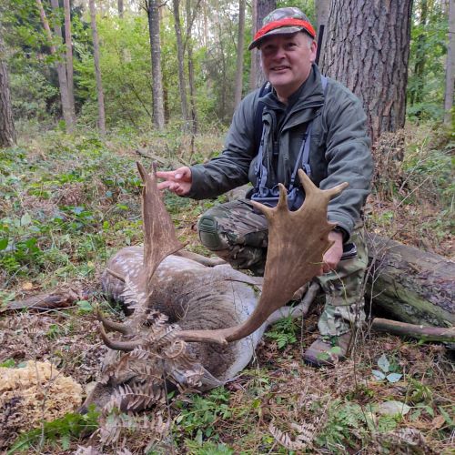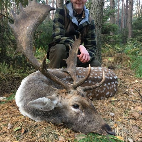 Da skuddet gik, gav dyret et ordentligt hop fra sig, og under min øjeblikkelige repetering, så jeg ikke om det fald i knaldet. Skytten stod bag mig og, hviskede at jeg skulle skyde igen. Desperat søgte jeg rundt på de nu meget urolige dådyr efter den jeg lige havde påskudt. Det lykkedes mig simpelt hen ikke at finde det dyr i riffelkikkerten, der lige var blevet skudt på. Efter 10-15 sekunder, som faktisk er ret lang tid, forsvandt flokken i løb. Skytten så på mig, og spurgte, hvorfor jeg ikke skød igen. Jeg kunne ikke se den der var blevet anskudt, fortalte jeg til ham, og han grinede bare hjerteligt.