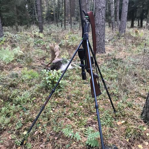 Det blev en ret hurtig pursch, og da vi fik øje på dem igen havde de også set os. De stod dog alle 3 stille, med bladet til os, og betragtede os mistænksomt. Afstanden var 180-200 meter og, hvis jeg mente at kunne klare det forsvarligt, skulle råen nedlægges. Jeg lænede mig op af et træ for at få mere stabilitet som skydestokken kunne give ved fritstående, og slap kuglen.