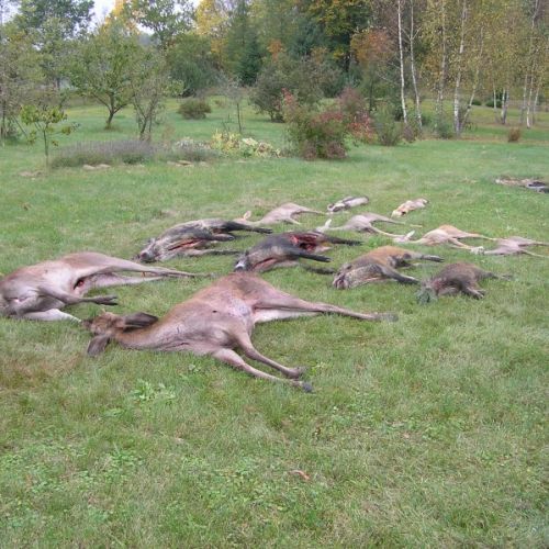 På trods af at: Janek, min jagtfører påstår, at han af og til kan lugte krondyrene, at vi hører hjortebrøl ganske Close Up, at vi indretter interimistiske jagtskjul, har siddet stille i diverse hochsitze i området i timevis, at vi jager tidlig og sent og sidst men ikke mindst, at vi lister rundt så ekstremt langsomt og stille som vi gør – på trods af det, har vi ikke set kronvildt i to en halv dag nu. Når man dertil lægger de mange timer der er brugt i området – er det en mental udfordring, at holde gnisten intakt. Især, når man har skullet lægge øre til beretninger om alle de krondyr, som Brian og de to andre jægere har set på deres outings. Janek og jeg har påbegyndt pyrschjagt nummer 5, i let foroverbøjet snige positur og endnu tidligere end sædvanligt efter aftensmåltidet. ”Pyrschen gehen ist pyrschen stehen! ” som tyskerne udtrykker det gamle jægerfif om, at holde øjne og ører åbne og benene lidt mere i ro. Det bliver flittigt efterlevet af Janek. Han scanner hele tiden terrænet for vildt med sin XXL Doctor kikkert og det er desværre ikke de rigtige arter vi spotter. I øvrigt ser vi ikke særlig meget vildt på disse outings. Området vi går i er temmelig stort. Det er ikke særlig kuperet, eller varieret for den sags skyld. Træerne er hovedsagelig fyr, gran, birk og unge egetræer. På de store marker dominerer hvede, græs og majs. En del af majsen står endnu gylden og kornbugnende og jeg kan ikke rigtig forstå, at vi ikke skal være tilstede med en pyrsch der. Vi har listet temmelig længe nu og tvivlen gnaver en lille smule, selvom Janek virker 110 % kompetent på alle områder. Da vi således har gået og stået temmelig længe, informerer Janek mig pludselig om at vi bliver nød til, at gå tilbage, tage jagtvognen (en golf med på svejset lad) rundt om skoven og på den måde snyde vinden. Som sagt så gjort. Herefter starter endnu en slowmotion pyrsch uden de helt store forventninger. Men som det ofte sker under en jagt, sker det også her. Uventet og pludseligt her i det tiltagende aftenmørke. Derovre i lysningen på den anden side af grøften går to vagtsomme hinder rundt og esser nervøst, alt imens en hjort ligger ned halvdækket af siv og højt græs, formodentlig for at restituere sig efter både elskov og kamp. Vi er i god vind for dyrene så vi kan hviske sammen, når det bare foregår uendelig stille og direkte henvendt til øret. Dyrene er ca. 150 meter ude. Vi er blevet stavns bundet til en lille plet under en forkrøblet rødtjørn. Da hjorten ikke vil rejse sig, så står jeg så her med riflen i anslag i skydestokken så længe, at jeg indrømmet! På et tidspunkt har lyst til, at kaste håndklædet i ringen. Lyset svinder hastigt her i den sidste time, hvor der må jages, hvilket er en time efter solnedgang. 5 minutter i skydetidsophør rejser hjorten sig og spejder i retning af os, jeg sætter tråd korset lidt højt på bladet, og da jeg får et GO fra Janek, sender jeg en stille bøn til Diana og klemmer aftrækket. Hjorten ryger ud af fokus i skuddet, så jeg kigger på Janek i stedet. Han har holdt kikkertfokus på hjorten lige siden før skuddet. ”Den er død, perfekt skud! Den gik lige ned! ” Siger Janek på et glad engelsk med polsk accent. Da vi kommer hen til hjorten kan jeg godt fornemme, at det heller ikke på Wierschlass, er hverdagskost med hjort i den kaliber. Den er stor siger han tørt og på polsk engelsk og ringer straks til førstejæger Carol Malinka for, at breake nyheden og skaffe assistance. Om jeg er glad? Regner det Danmark i november? Vi tager et par dårligt belyste fotos, får lidt vand og kaffe. Og så skal det store dyr læsses op på Karols ladvogn. Tak til Janek og Wierschlass for en rigtig god Jagt og jagtoplevelse.