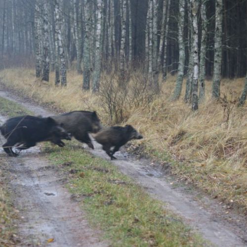 Min kvote for bukke var nu fyldt, og jeg spurgte om der var mulighed for at skyde en gris hvortil Mathæus svarede, at der var en mulighed hvorefter vi kørte et lille stykke og parkerede bilen. Vi gik meget forsigtigt frem ad en skovvej, hvor der på begge sider var tydelige tegn på aktivitet fra vildsvin. Da vi kom frem til en mark, gik der en so med 8-10 smågrise. Inden vi rigtig havde besluttet hvad vi ville, kom en überläufer ud fra skoven. Jeg spurgte om jeg måtte skyde den, og fik lov. Her gav jeg mig rigtig god tid, og da skuddet gik, sank den sammen hvor den stod.