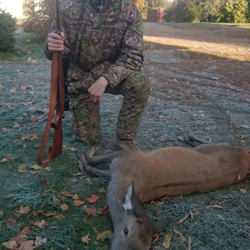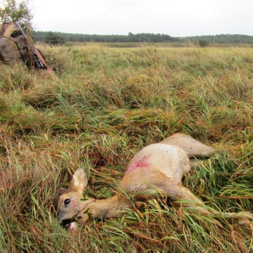 Fra træerne foran os kom en rå ud og gik og essede. Den havde et meget stort yver, så den havde formentlig lagt lammene af inde i træerne. Pludselig blev den lidt urolig og kiggede til vores venstre side. Der kom en buk ud fra hegnet. Den kom lidt ud på marken og vendte siden til. Da jeg skød sprang den højt i vejret og løb et stykke hvorefter den forsøgte at vende, men faldt om.