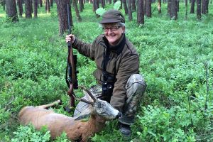 30.05. Efter en kop te var der afgang i terrænet kl 04,00. Mathæus kørte ud i et landbrugsområde med små marker og lidt hegn. Her blev bilen parkeret og vi gik lidt rundt. To smaldyr fjantede rundt. Lidt efter blev de efterfulgt af en spidsbuk. Med tanke på min forbier fra aftenen i forvejen prøvede vi, om vi kunne komme til skud på bukken. Det lykkedes, og den faldt perfekt for kuglen. Afstanden var ca. 100 m og dermed betydelig længere end ved forbi skuddet