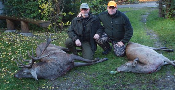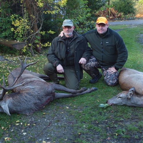 Da vi kom tilbage til huset, stod Poul, nordmænd, samt skytter og ventede. Paradepladsen var tom, så det var med et stort smil at mine 3 dyr blev lagt frem. Det viste sig dog at Poul også, havde haft gang i hans Winchester model 94 (kaliber .307 Win), og fået en kronhind, som allerede var kørt i kølehuset. Den ene af de 2 flinke nordmænd, var kommet til skud, men som han sagde, var det en bommer.