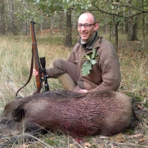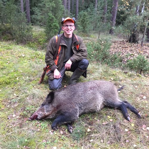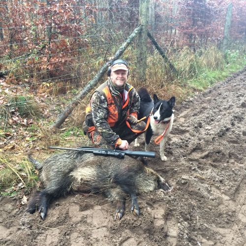 Jeg ærgrede mig da turen fortsatte, det ville have været dejligt, hvis det kunne lykkedes med et vildsvin. Vi kom kun til at køre i meget kort tid, inden der kom en flok svin ud på vejen foran bilen. Vejen var helt lige på dette stykke og gik tværs over en lavning. Svinene kom på den anden side af lavningen og var på vej ned i denne. Afstanden vil jeg vurdere til at have været omkring 250 meter. Da svinene kom lige imod os på vejen, var der rigeligt tid til at komme ud af bilen og få skydestokken op. Jeg fandt dyrene i riffelkikkerten, men med soen forrest, og alle grisene lige bag hende kunne jeg ikke skyde. Pludseligt drejede soen af ind i skoven, og grisene kom fri. Da den sidste gris skulle til at dreje efter dens artsfæller, løsnede jeg skuddet. Afstanden var på det tidspunkt kommet ned på Ca. 120 meter, og jeg var så sikker på at skuddet skulle sidde der, at det kom som en overraskelse at grisen ikke klappede sammen.
