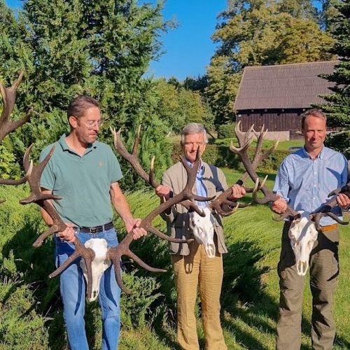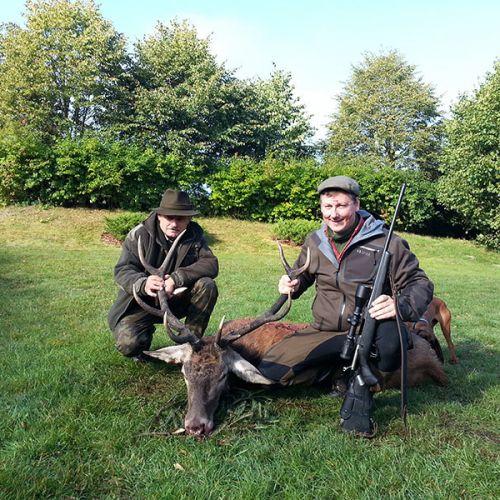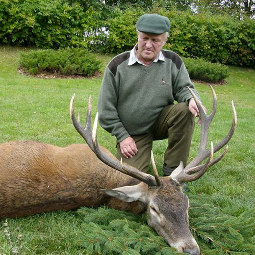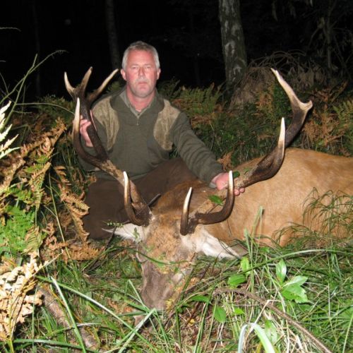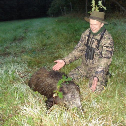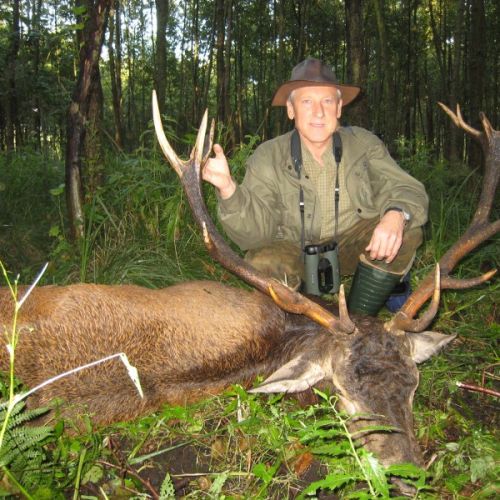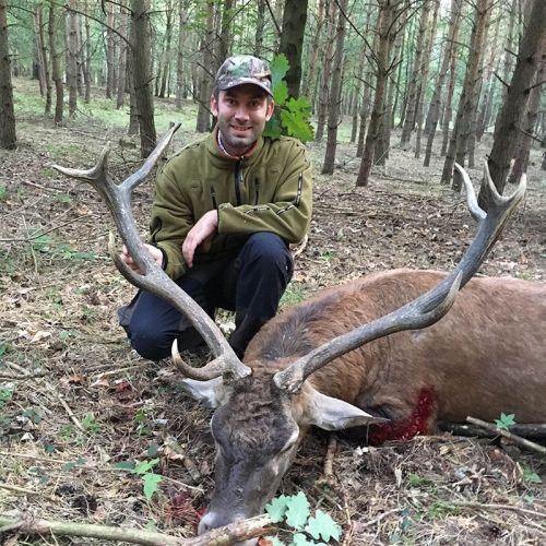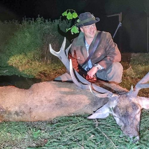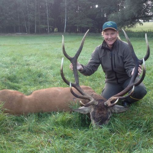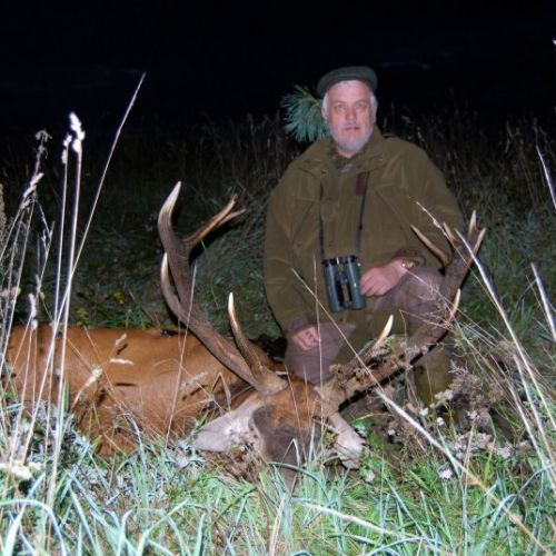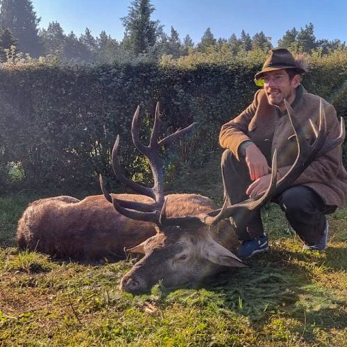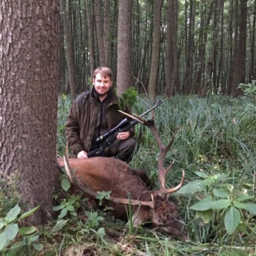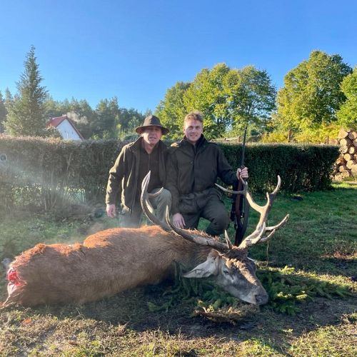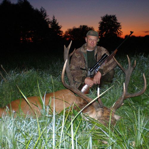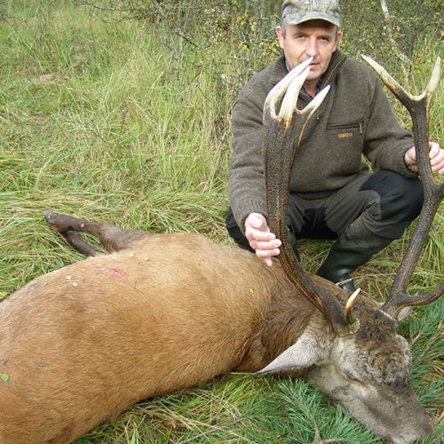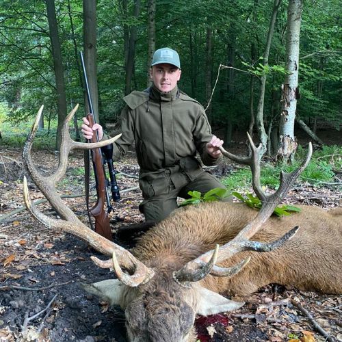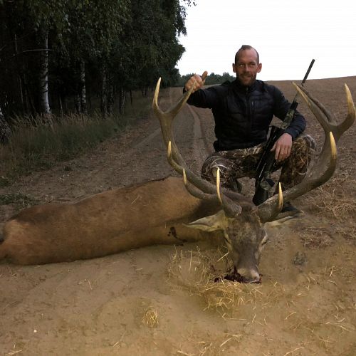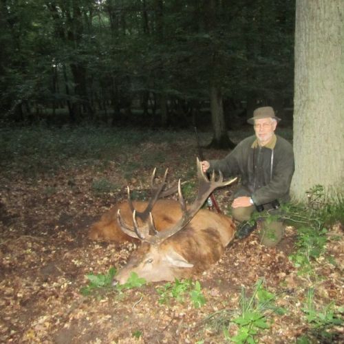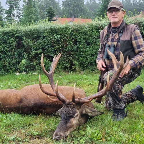 Min jagtfører stod og vurderet hjorten, og til sidst fik jeg tegnet – den er selektiv, og perfekt til afskydning. Pürchen blev sat i gang – Hjorten var gået igennem nogle træer, og havde kursen mod et åbent stykke eng. Vi pürschede os ind på 70 meter, og spændingen steg, hjertet bankede hurtigere – feberen havde meldt sin ankomst – men hjorten stod perfekt med bredsiden til, så det var en skuddet skulle falde, inden den fik færten af os. Hjorten blev ramt med en perfektbladkugle, men kæmpede en kamp for at forsætte, så den fik endnu en kugle og faldt efter denne. Feberen forsatte efter denne fantastiske pürch med et fantastik resultat, og benene rystede, så der skulle gå fem minutter, før vi kunne komme hen og se hjorten. En fantastisk hjort ventede os – en fuldstændig regelmæssig 10-ender på 6,3 kilo var forendt, og en lykkelig og glad jæger stod ved siden af, og nød oplevelsen til fulde.