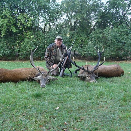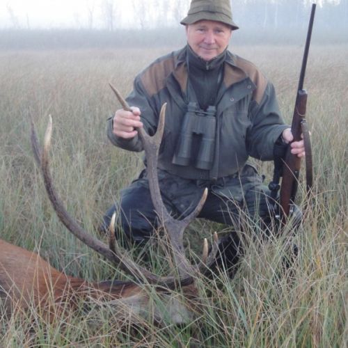 Jeg brugte min ekstra tid på at prøve at skyde en kronhjort, sådan som jeg har prøvet det mange af de andre år i Dabrowa uden held. Denne gang lykkedes det. Arek og jeg var på vej i hochsitz sidst på eftermiddagen den anden dag dernede. Jeg havde kort forinden været så heldig at skyde den første af dåhjortene. På vej mod hochsitzen ser vi 2 kronhinder så i kanten af et skovområde. De var urolige og anede tydeligvis, at noget var galt. De lister stille og roligt ud på midten af engen og inde fra skovområder får de følgeskab af mere end 20 stykker kronvildt. Hele engen var en lang række af kronvildt. Hinder, kalve og spidshorte mellem hinanden og næsten helt til sidst en fin kronhjort. Heldigvis trak den på et tidspunkt fri af alle de andre dyr, og jeg kunne lade kuglen gå på en afstand af 150 m. Herefter søgte den op ad en bakke og forsvandt i skoven, hvor vi fandt den vel 300 m fra skudstedet. Hjorten var en otteender på 4,2 kg.