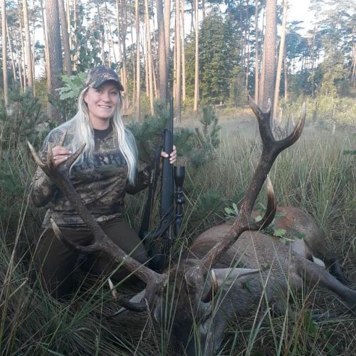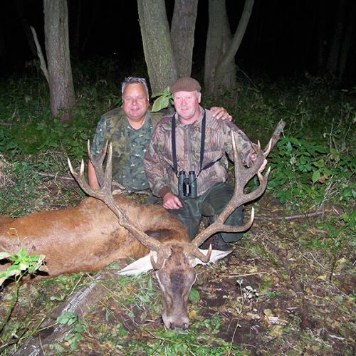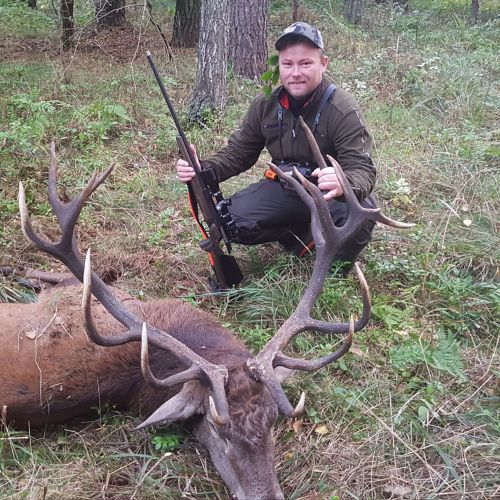 Netop hjemme efter en pragtfuld Hjortejagt på Zamrzenicia med godt gang i brunsten på trods af ekstrem varme. Et højtryk over Polen med dag temperaturen på 25-27° og en dag med 30° var jo ikke ligefrem hvad man havde ønsket, men hjortene lod sig ikke mærke med varmen og brølede ofte allerede ved 17 tiden flere dage. En aften havde vi aftalt at vi ville starte i et tårn og derfra begynde pürsch på den første hjort som brølede, efter 10minutters venten var det afsted, en spændende skov pürsche på ca. 45 minutter hvor vi kommer ind på den brølende hjort som gik i et svært fremkommeligt gammelt grand stykke sammen med et par hinder. Da den endelig stod godt fri i en af rækkerne kunne vi se at det var en ung flot 10ender på ca. 5kg. Jeg havde besluttet mig for en der skulle være lidt større og da der var flere dage tilbage takkede jeg pænt nej til denne hjort og vi listede stille af igen. Næste morgen hørte vi flere hjorte men så ingen, da vi på et tidspunkt er oppe i et tårn for at spotte lidt kommer et vildsvin ud af granderne 100 meter til venstre for os og sikrer ganske kort hvorefter den rask traver ud i det åbne og stopper op en gang for hurtigt at forsvinde i egene på modsatte side, og havde ikke været for en gren med blade som hang ned på siden af tårnet var den nok endt i kølehuset.
