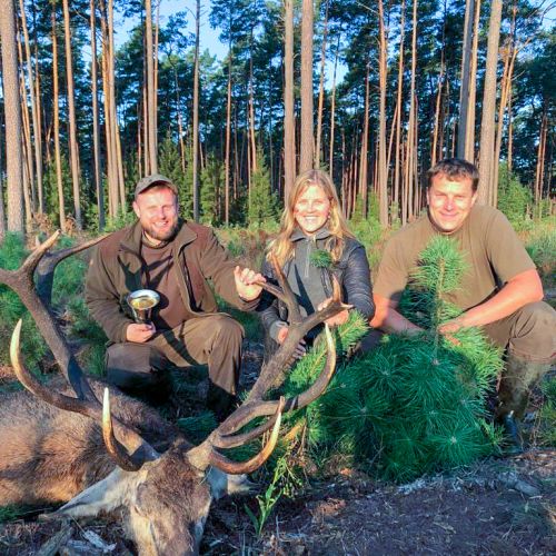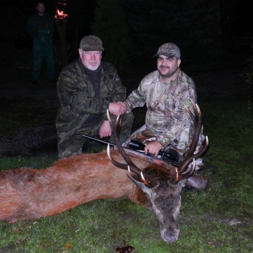 Min umiddelbare vurdering omkring tidspunkt for aktivitet i skoven viser sig heldigvis ikke at holde stik da Wojciech efter blot et kvarters venten puffer til mig og hvisker med friskhed i stemmen, at der kommer en hjort. Ud af ingenting kommer pludselig en hjort travende mod os bag fra, løber næsten forbi på vores højre side. Den stopper 40 meter ude i kanter af de høje fyrrestammer og sikrer ganske kort inden den vil krydse det nyplantede stykke. Mens den står og sikrer, er bladet dækket af et par fyrrestammer men med en klar fornemmelse for hans næste træk er riflen afsikret og hans første skridt bringer ham ud på skovvejen hvor skuddet kommer og han falder for en lidt høj kugle der tager ryggen men som hurtigt suppleres af et fangst skud på halsen.