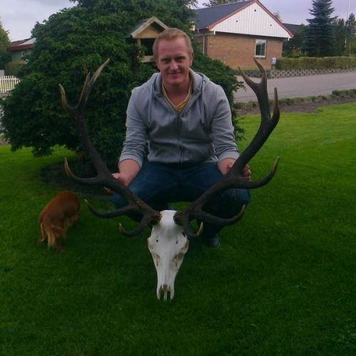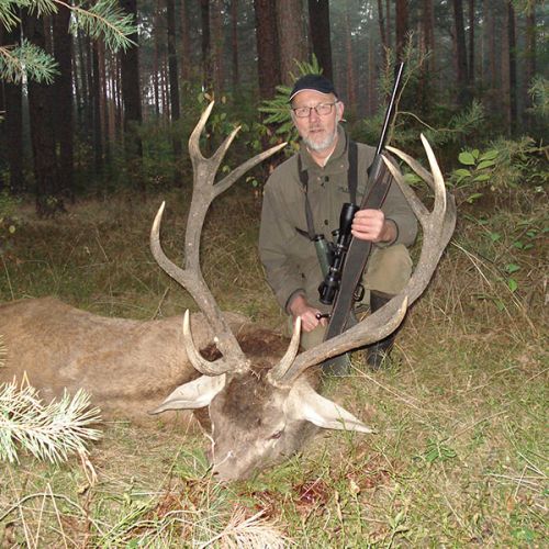 Netop hjemvendt fra en dejlig jagt i Polen på brunst hjort, brunsten udeblev desværre og vi havde dårligt vejr. Skød denne prægtige åhjort efter en lang pursh kom han endelig på scenen , jagtføren spottede ham , jeg kunne ikke se noget som helst i den tætte skov. Jagtføren satte skydestokken klar, jeg lage riflen klar, fikserede et punkt og det punkt kom han ind i, havde valgt at afgive et højt blad skyd og ventede bare han ville komme fra højre. Pludselig passere han træer først geviret så forkroppen og da han stod perfekt stadig halvt dækket af træet sendte jeg missilet afsted.