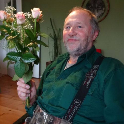 Det sidste billede viser den gode Kim. Det var 25. gang, at vi sammen tog på jagttur i Polen (alle gange i øvrigt med Diana ), og han mente, at han havde fortjent blomster for at have holdt mig ud i så mange år. Vores værtsfolk Karolina og Arek tog ham på ordet og fremskaffede en buket, som jeg så kunne overrække ham den næste dag.