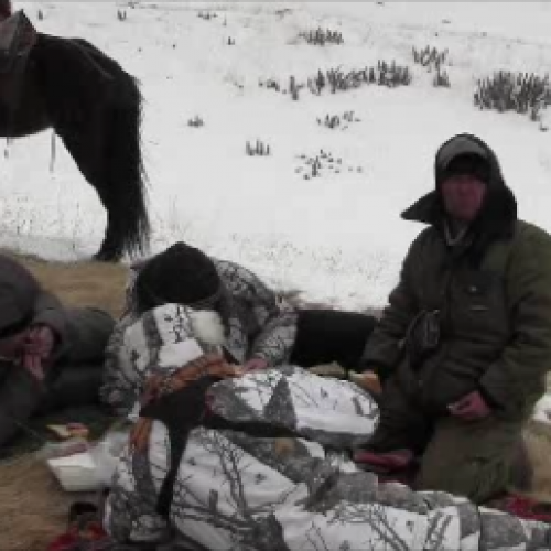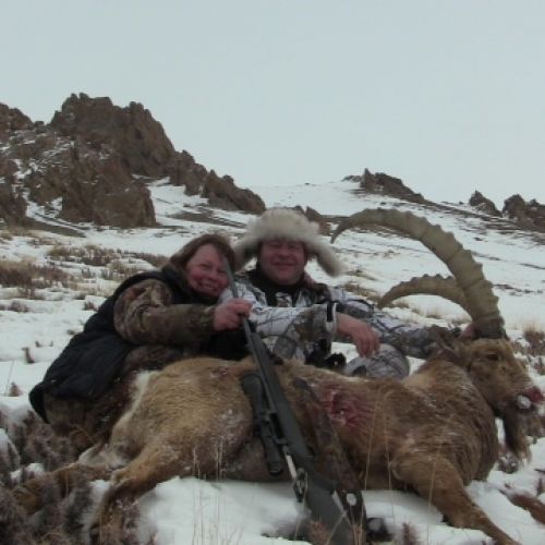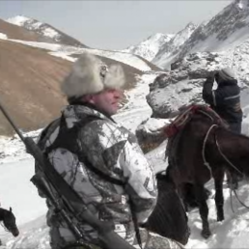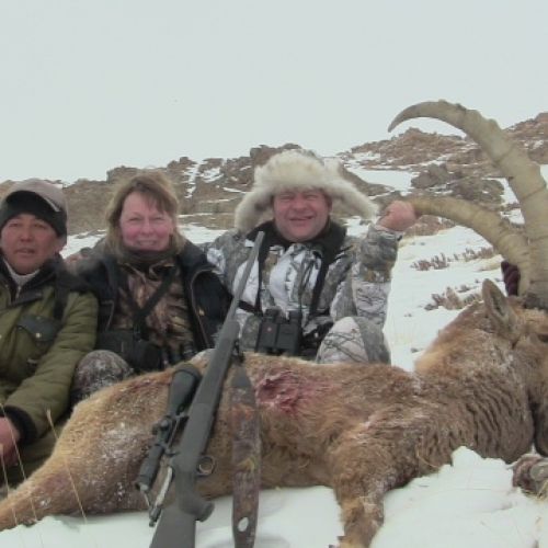 Turen forløb uden problemer. Vi kørte langs den store sø Issyk-kul, som er ca. 280 km lang. Vi passerede bjergpas på over 4.000 meters højde. En fantastisk natur. Køreturen er lang, men forventningerne var store, så det føltes ikke så langt. Vel ankommet til lejren, som lå i ca. 3.300 meters højde i Tian-Shan bjergene, var det tid til udpakning. Vi fik tildelt et værelse med rigtige senge, ligeledes var der også en kakkelovn, så det var en luksuslejr vi var ankommet til. Det er ellers ikke lige det, jeg er vant til fra tidligere bjergjagter. Efter lidt mad, gik vi tidligt i seng. Næste morgen bød på minus 12 grader. Efter morgenmad skulle der indskydes, hvilket forløb planmæssigt. Hestene var sadlet op, og vi kunne ride afsted. Hestene var meget godmodige. Vorherre har ikke tænkt sig om, da han skabte manden og hesten. Der er ”noget” der er i vejen. Vi red ca. 2,5 time før vi spottede den første gruppe ibexer. Der var en med gode horn iblandt. Når man siger gode horn, mener man mellem 90 cm og 1 meter. Denne her var over 1 meter. Vi startede opstigningen med hestene indtil dette ikke længere var muligt, herefter var det til fods. Luften er tynd, når man som her når op i 3800 meters højde, så det er ikke nogen skam at puste lidt. Pludselig kommer flokken løbende ca. 300 meter ude, men den store var desværre ikke iblandt. Vi ventede ca. 1 time, men forgæves. Så turen gik igen nedad, hvilket også kan være hårdt. Efter nedstigningen var det tid til frokost. Denne blev indtaget på et tæppe i sneen, men i det dejligste solskin, og med et fantastisk udsyn over bjergene, hvor vi kunne se Marco poloer gå og græsse. Frokosten bestod af brød, pølse, ost, karameller, vand og te. Temperaturen var ca. 0 grader. Efter frokost skulle vi videre ind i et nyt pas. Den ene guide red i forvejen for at spejde. Da vi ankommer, står han med et stort smil på. Han havde set en flok på 4 ibexer, hvoraf der er 2 gode iblandt. Taktikken er, at vi skal snige os op bag en lille klippe ca. 400 meter oppe. Nu er det vigtigt, at alle 5 yder det bedste udi at gøre sig usynlige. Min kone er med for at filme, men må erkende, at det bestemt ikke er som i de spanske bjerge, og hun må opgive at komme med op.