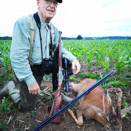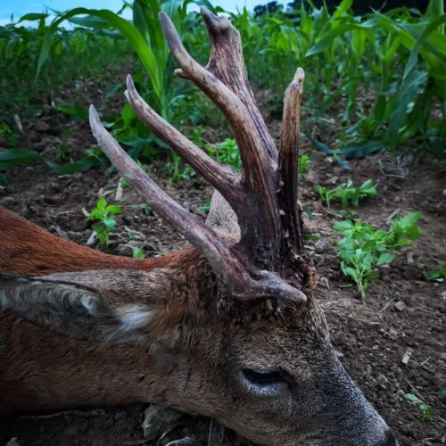 På kanten af kornmarken skød skoven ud i marken, nærmest som en tange. Dette sted blev vores “stand” med udsigt mod øst. Solen var lige gået ned. Da Lucas første gang afsøgte majsmarken med kikkerten, blev han ret tændt og satte hurtigt skydestokken op. I mellemtiden kunne jeg også se bukken. Dyret befandt sig mellem nogle majsrækker. Jeg kunne ikke se dens krop, men der var masser af opsats, der stak op. Jeg satte riflen i skydestokken og sagde til Lucas; "OK. Få ham op.". Lucas råbte. Intet skete. Han råbte igen og højere. Bukkens ører bevægede sig. Lucas råbte nu virkelig meget højt og så var der bevægelse. Jeg vidste af erfaring, at selv hvor atletisk, yndefuldt og hurtigt et rådyr er, så rejser det sig ikke hastigt op fra søvn. Først kom dyret på forben, så oprejst, hvorefter den strakte sig. Denne gang var lykkens gudinde med mig. Bukken stod op. Skuddet var velplaceret, og dyret var nede.