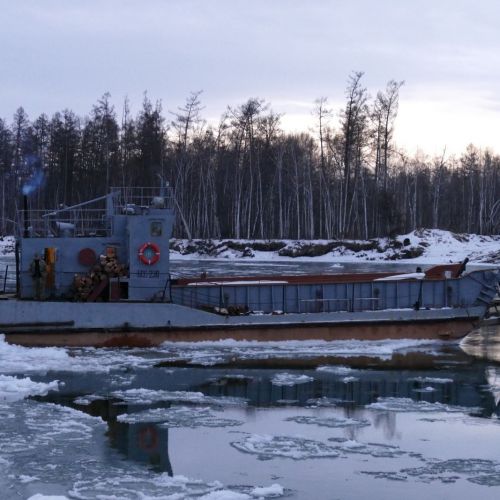 Men i Rusland er planer ganske flygtige. Færgen lå stille med siden mod sejlretningen 20 meter ude i vandet med to små biler ombord. Det ramponerede lille skib var tydeligvis hjælpeløst strandet og et tykt lag rimfrost på bilernes forruder afslørede, at de i hvert fald havde ligget der hele natten. Jagtchefen Yevgenij, som skulle køre os ud til jagtområdet, sukkede højlydt ved synet, rystede opgivende på hovedet og steg ud for at løse problemet.