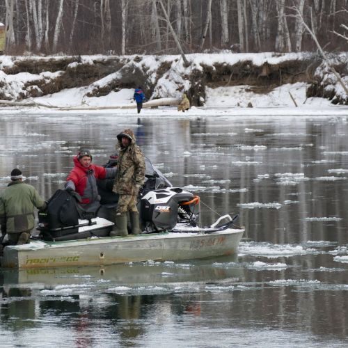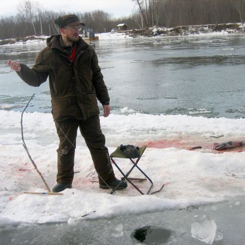 En gammel kone og hendes midaldrende søn fiskede med tykke nylonliner laks igennem små huller i den smalle isbræmme langs bredden. De færdedes ganske uforfærdede på isen få meter fra den rivende flod, som var fyldt med store drivende isflager.