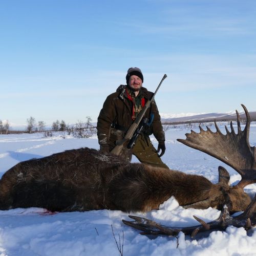 Igennem de forkrøblede birketræer så jeg den sorte silhouet af tyren, som travede mod det åbne stykke og jeg kastede riflen til kinden. Jeg var meget bevidst om, at det ville blive et skud i spring og at jeg ikke ville kunne mærke aftrækkeren. Jeg valgte derfor at stikke snellen og udløse skuddet med et uortodokst vip med fingeren i stedet for et følt aftræk, da den fine røde prik befandt sig i ret højde under elgtyrens øje. Skuddet ramte, som planlagt, elgen højt på bladet og det store dyr styrtede forover med en sådan kraft, at den ene skovl borede sig dybt ned i sneen. Med et enkelt skud var en gammel drengedrøm om engang at nedlægge en virkelig stor elg gået i opfyldelse.