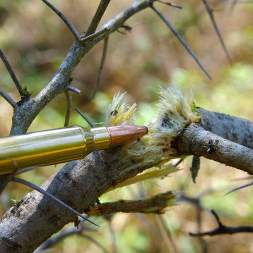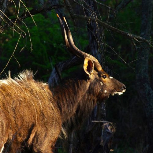Sekundet senere så jeg den flygtende nyala gennem tæt krat på cirka 30 meters afstand og han så mig! Med et kraftfuldt spring satte han af til siden og løb nu i fuldt firspring væk fra floden med siden til mig. Jeg havde instinktivt kastet riflen til kinden, afsikret den og fulgte nu den springende tyr gennem buskene. Jeg var gået på automatpilot i drivjagt-mode! Lidt længere fremme øjnede jeg en åbning mellem træerne. Da tyren passerede, var min pegefinger tilfreds med inputtet fra kikkerten. Skuddet bragede og ramte nyalaen midt i et spring præcis der, hvor halsen sidder fast på rygraden.