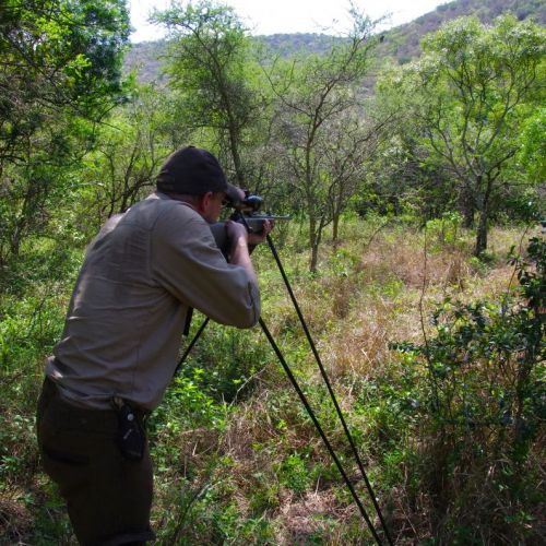 Jeg jagede atter med min Mauser M03 i .300 Winchester Magnum med en Zeiss Victory HT 2.5-10X50 på toppen. Helt sikkert for meget energi til et dyr som kun vejer omkring 12 kg. men til nyalaen var kaliberet ganske passende og jeg måtte blot være omhyggelig med at placere mit skud bag skulderen på duikeren, så ville de bondede Norma Oryxkugler formentlig være ganske varsomme.