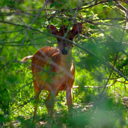 Jeg flyttede pegefingeren uden for bøjlen. Hunnen standsede midt i åbningen og stirrede opmærksomt på os. Det var det eneste tidspunkt jeg så en red duiker stå stille og det varede højest et par sekunder. Hun vimsede hurtigt videre og kaldte advarende på hannen som sekunder senere dukkede op i den samme åbning.