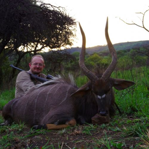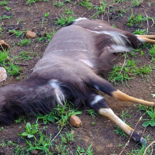Områdets mere end 1.500 nyaler legede gemmeleg i varmen. På en lang og sveddryppende morgenpursh så vi kun et enkelt hundyr i et område, som normalt vrimler med nyaler. På vej hjem til frokost havde vi held til at nedlægge en gammel wildebeest tyr på en åben græsslette og således var dagen bestemt ikke resultatløs.
