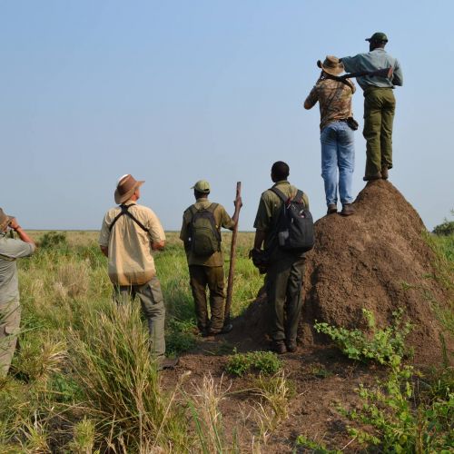 Det var nu min tur til bære riffel, og dagen startede med at vi kørte ud til et træ som blev omtalt som bøffel træet. Der kravlede 2 lokale sporer op i træet, for at ser efter dagga boys, de kom dog først ned efter en halv times tid, da der hang en tæt dis over sumpen, et tegn på at det skulle blive en meget varm dag. Sporerne har spottet 2 dagga boys et stykke ude i sumpen, men på et tørt område.