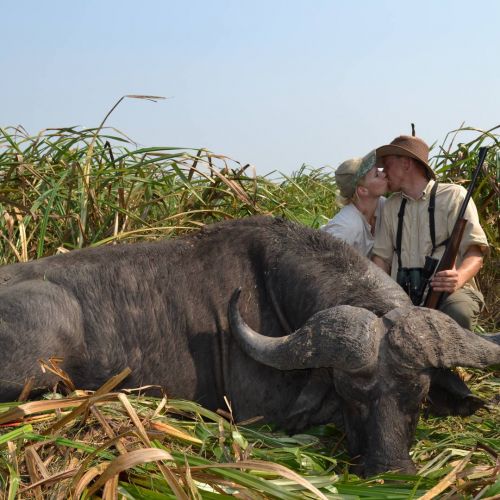 Vi nåede forbi de værste siv, og kom til et område med mere spredt siv bevoksning, og der var også fast grund under fødderne. Vi pürschede videre, og kunne pludselig se en bøffel, der gik græssende, 60-70 m fra os, op med skydestokken, og rifflen op, Sakkie snakkede stille og roligt, til mig, bare tag dig godt tid, jeg pustede langsomt ud, og skød første skud, bøflen satte i løb, skråt hen forbi os, jeg repeterede og skød 2. skud, jeg kunne også høre dette skuds anslag, jeg repeterede igen, fandt bøflen i kikkerten, men den var nu inden i noget langt siv, ca. 25 meter væk, jeg kunne kun se den i glimt, men jeg lod 3. skud gå, og så var den væk.