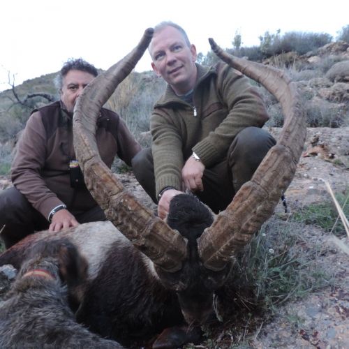 Vi havde allerede talt med Luis om inden afrejsen, at det var en helt speciel stor Sierra Nevada Ibex vi gik efter, som de havde set en del gange. Allerede kl. 10 så vi ham liggende ca. 700 mtr. Væk på en bjergside. Vi lagde en strategi om, at Luis skulle blive i dalen vi var i, for at sikre sig hvor den var og min søn Andreas, den anden guide Andre og jeg skulle køre op bag om bjerget og vente til han rejste sig. Ifølge alle erfaringer ville ibexen søge mod toppen og der ville vi få kontakt med den. Men den var klogere end os og valgte at løbe langs med bjerget, så den kom ikke op til os. Vi kørte ned i den nærmeste landsby for at få frokost, tapas, som var udsøgt lækkert. Tilbage om eftermiddagen for at spotte ham igen, men uden held. Vi så en del hundyr og små bukke, men ikke ham vi var på udkig efter.