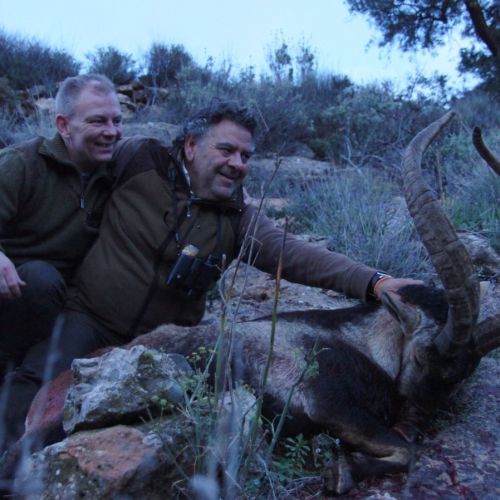 Da vi kommer derop, ser jeg at ibexen står med front mod os og kigger lige på os, jeg gør klar til at indtage en liggende skydestilling, men Luis fortæller mig, at der ikke kun er 1 men hele 3 ibexen og den der står og kigger på os ikke er den største. Jeg får lagt mig ned, foldet støtteben til riflen ud, så jeg kommer over vegetationen, indstillet asv på 200 mtr. Og kigger i fiffelkikkerten. Til venstre for den der står med front til os, står en ung ibex, den er helt brun i pelsen endnu, hvilket de er til de når over 10 år, men kan stadig ikke se den rigtige. Så pludselig træder den et skridt frem bag nogle buske, jeg er ikke i tvivl, den er kæmpe!