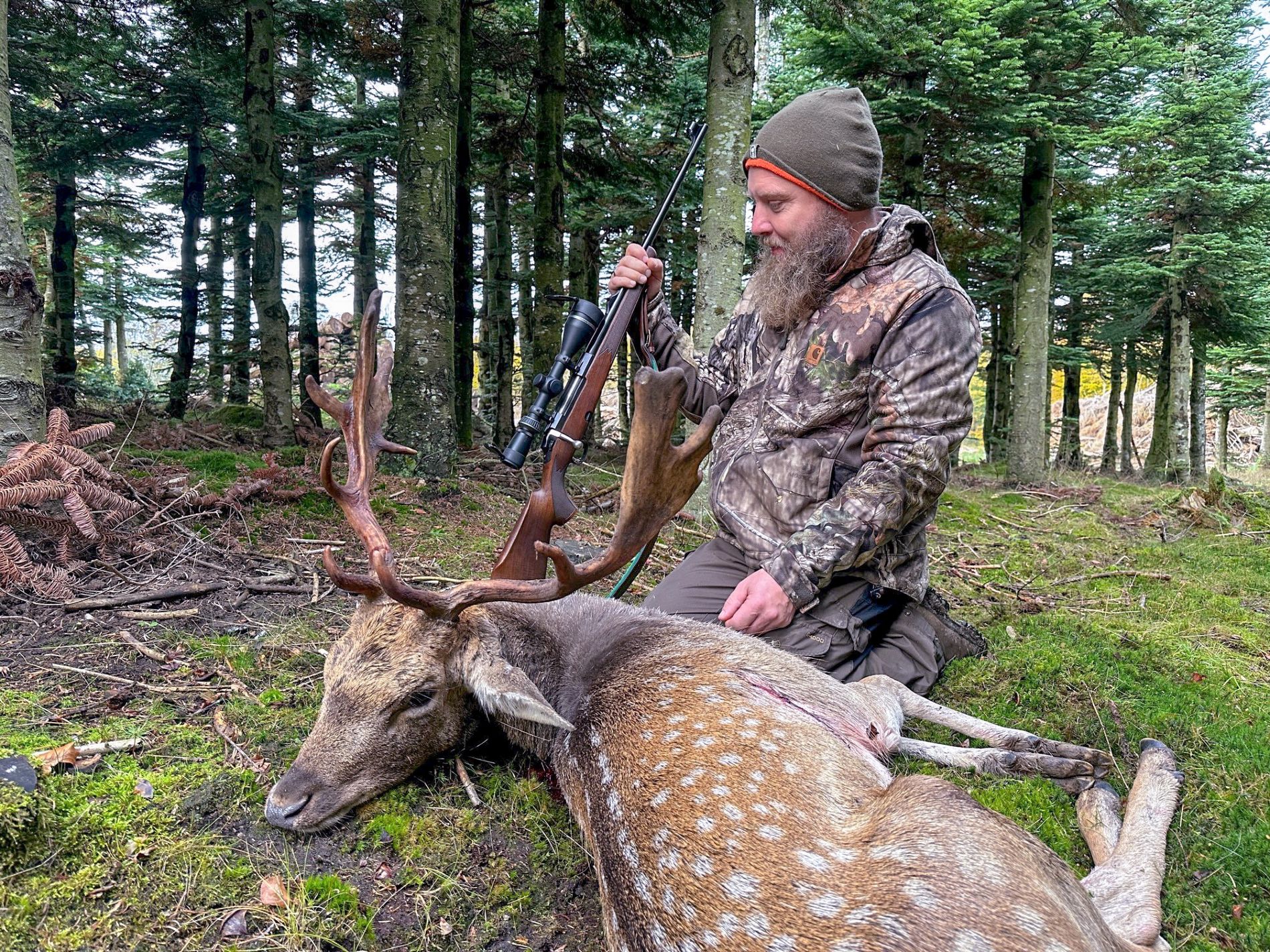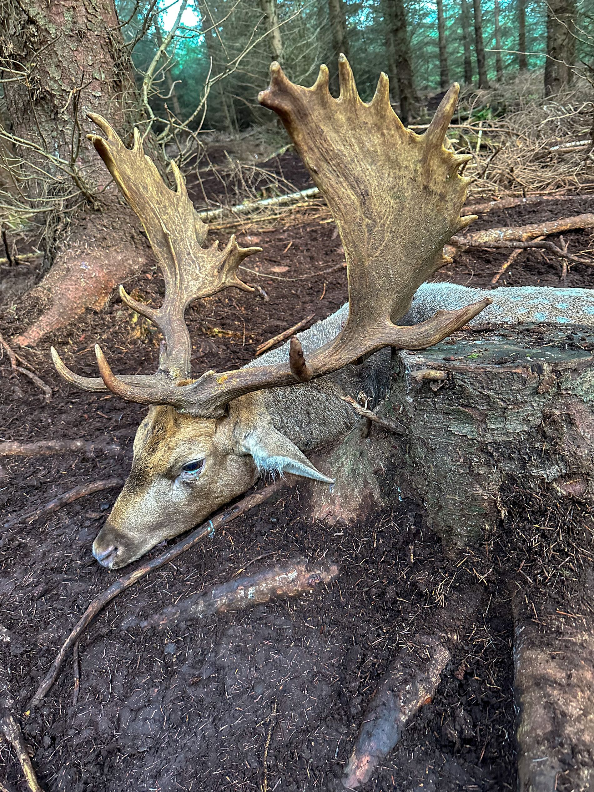 Kasper var heldig og skød en flighjort den første eftermiddag, efter at have hørt og set mange hjorte. Det var Kaspers allerførste dåhjort, så han var ovenud tilfreds.