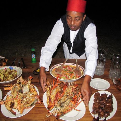 Maden er af høj klasse. Hver dag serveres et godt og solidt morgenmåltid med bl.a. frisk frugt, bacon og æg, nybagt brød og kaffe eller te. Frokosten i campen består af 2-3 retter, men på dage, hvor der jages i de fjernereliggende områder, medbringer man en dejlig picnic frokost. Middagen er også altid en 2-3 retters menu, og udbuddet af gode vine, spirituosa og øvrige drikkevarer lever helt op til madens høje kvalitet.