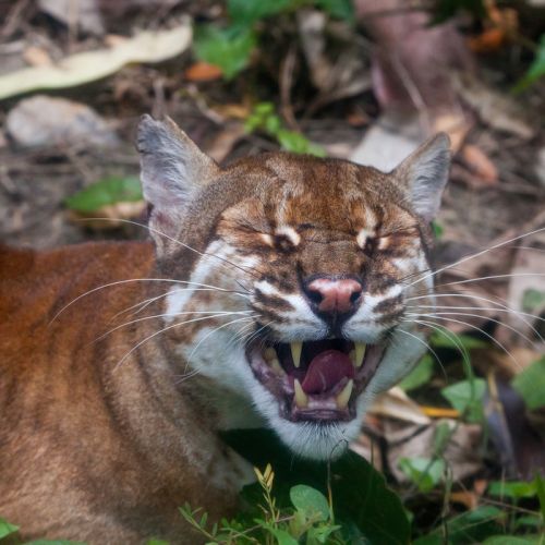 Beskrivelse: Ved første øjekast, minder Guldkatten om en lille puma, men er mere langbenet og har ansigtstegninger og mørke længdestriber, parallelt med snudepartiet. Kropsvægt, op til 11 Kg og en kropslængde uden hale (55 cm) op til 105 cm.