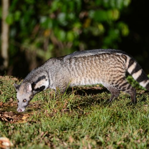 Beskrivelse: Også kaldet desmerkat. Brungul bundfarve, uregelmæssige rustrøde pletter. Halen sort og hvidstribet. Kropsvægt op til11 Kg, Kropslængde uden hale (43 cm) godt 80 cm.