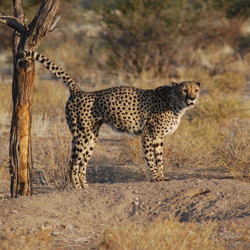 Beskrivelse: Mellemstort dyr af kattefamilien med lang slank krop og lange tynde ben. Geparden kan opnå en vægt på 40 - 70 kg og en højde på ca. 70 cm. Skindet er gulligt med sorte pletter. Geparden har lang hale. Den er kendt for at løbe sit bytte ind med hastigheder der ligger omkring 120 km/t, og er dermed det hurtigste landlevende pattedyr i verden. Geparden forlader sit bytte når den er mæt, og kommer i langt de fleste tilfælde aldrig tilbage. I Mellemøsten trænes geparder til Gazelle-jagt, hvor de så bruges i forbindelse med drivjagter på ørkengazeller.