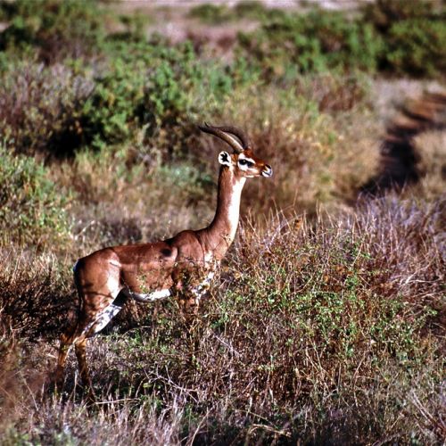 Beskrivelse: Smuk rødbrun gazelle med den karateristiske lange hals, der har givet den tilnavnet girafgazelle. Gerenukken vejer ca. 35 - 50 kg og måler ca 100 cm over skuldrene.