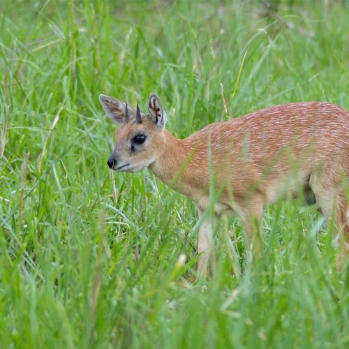 Beskrivelse: Lille antilope med en vægt på 8 - 12 kg og en skulderhøjde, der normalt ikke overstiger 50 cm. Grysbucken er gråbrun med hvide aftegninger over øjnene og under halsen. Hornene, der er meget små, er sorte med små tværgående rille.