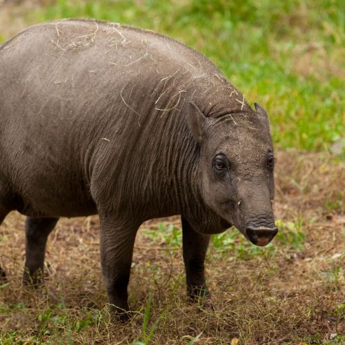Beskrivelse: Stort svinelignende dyr, med besynderligt lange hjørnetænder i både over- og underkæbe. Hjørnetænderne i overkæben gennemborer overlæbens hud og vokser opad og bagud, så kraftigt at de kan minde om et par horn, evt. så kraftigt at de trænger ind i pandehuden. Kropsvægten ligger på godt 100 kg, kropslænge på 1 meter, samt en skulderhøjde på 80 cm.