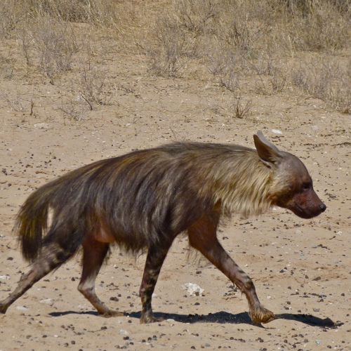 Beskrivelse: Mellemstort hundelignende dyr med kompakt krop og kraftige ben. Den opnår en vægt på ca. 50 kg og en højde på 80 cm målt over skuldrene. Hovedet er bredt og snuden kort. Bagkroppen er noget lavere end forkroppen hvilket er med til at give dyret det for hyæner så karakteristiske udseende. Pelsen er halvlang og brun med en grå plamage over nakken og på skuldrene. Benene er lysebrune med mørkebrune tværstriber. Hyæner er primært ådselædere, der er i stand til at æde og fordøje fordærvet kød. Kun sjældent nedlægger de selv deres bytte, der så ofte vil bestå af nyfødte antilopekalve. Hyæner er i stand til at knuse selv meget store knogler med deres kraftige kæber.