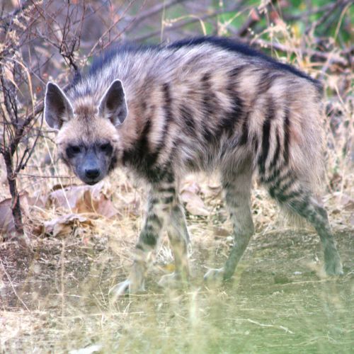 Beskrivelse: Relativt lange ben, og har på flankerne vertikale mørke striber og en forholdsvis lang nakkemanke. Benene er stribede, og hovedet er typisk hyæneagtigt med kraftige kæber. Kropsvægt indtil 55 Kg, Kropslængde uden hale(35 cm) 120 cm, Skulderhøjde op til 80 cm.