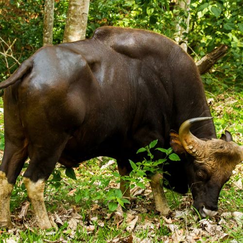 Beskrivelse: Stor brunsort vildokse med lyse ben, kraftig strubesæk og kraftige fremad- og opaddrejende horn. Denne art blev først opdaget i 1936.