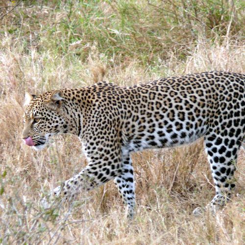 Beskrivelse: Mellemstort dyr af kattefamilien med kompakt krop og kraftige ben. Leoparden kan opnå en vægt på 60 - 90 kg og en højde på ca. 70 cm. Skindet er gyldent med sorte ringe. Leoparden har en kraftig lang hale. Leoparden jager sit bytte ved at ligge på lur, ofte i træer eller på klipper. Når byttet går under stedet hvor leoparden ligger gemt, springer den ned og dræber dyret med et bid i nakken eller struben. Kan den ikke spise op, vil den i langt de fleste tilfælde vende tilbage indtil flere gange, til der er spist op. I mellem måltider gemmer leoparden sit bytte oppe i træer eller i klippehuler.