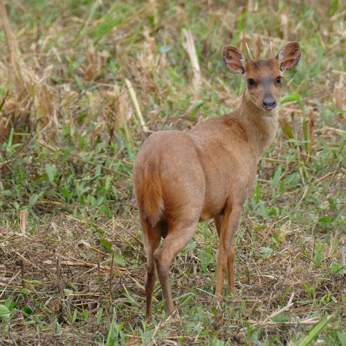 Beskrivelse: Relativ lille, råvildtstor hjort med "spidsbukgevir". Maksimal kropsvægt på 21 Kg, kropslængde uden hale (15 cm) von 1,30 meter og en skulderhøjde på ca. 70 cm.