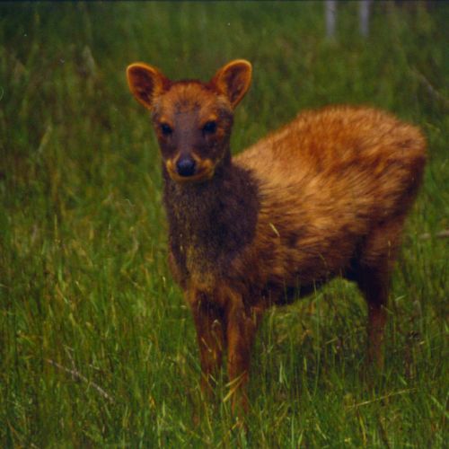 Beskrivelse: Verdens mindste hjorteart med en kropsvægt på indtil 8 Kg, en kropslængde uden Hale (3 cm) indtil 60 cm og en skulderhøjde indtil 35 cm. Lille spidst gevir uden sprosser.